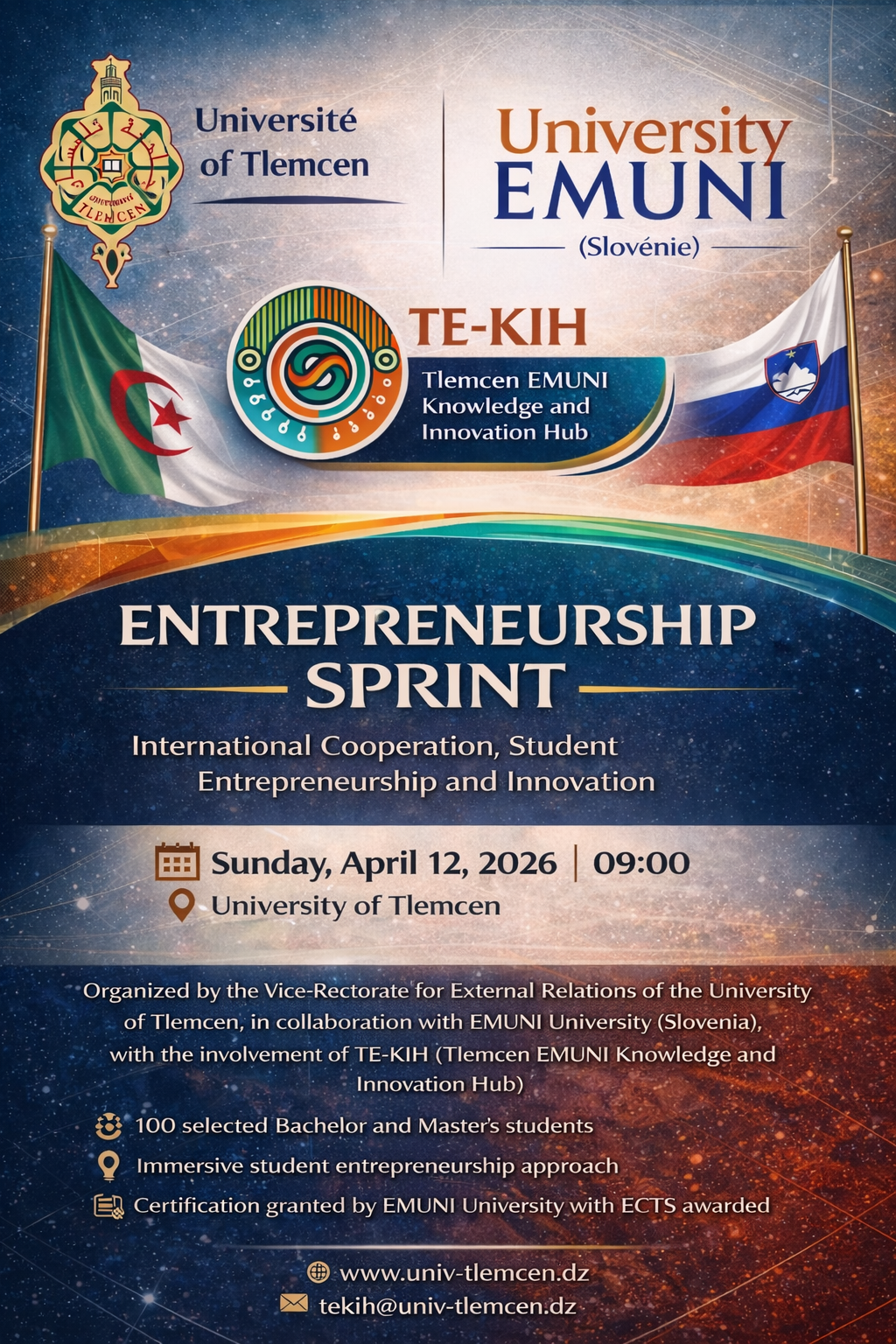 The University of Abou Bekr Belkaid Tlemcen, through the Vice-Rectorate for External Relations, Cooperation, Animation, Communication and Scientific Events, in collaboration with EMUNI University (Slovenia) and with the involvement of the TE-KIH Center (Tlemcen EMUNI Knowledge and Innovation Hub), is launching a call for applications for students who wish to participate in the following event: